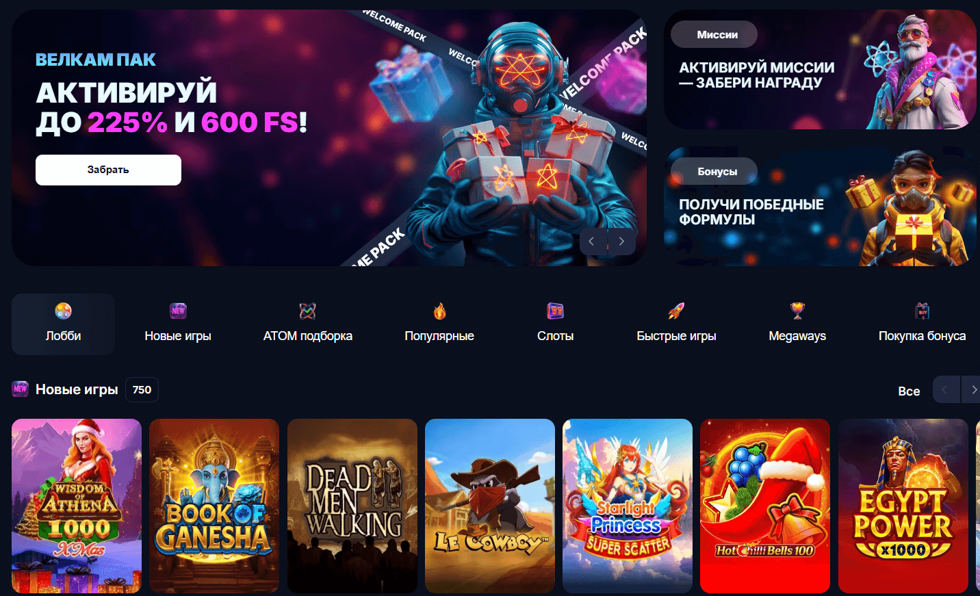 Сайт Atom (Атом) выполнен в современном «казино-стиле»: интерфейс не перегружен, а основные разделы — слоты, настольные игры, live-казино, акции и личный кабинет — расположены логично и читаемо. На главной странице заметен баннер с актуальными предложениями, поэтому промо-активности не нужно искать вручную.